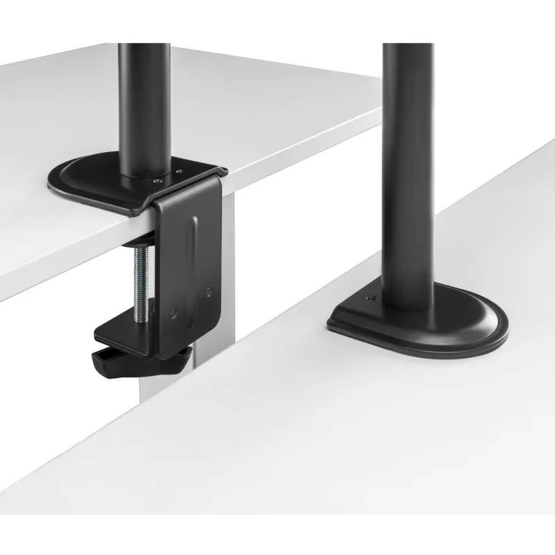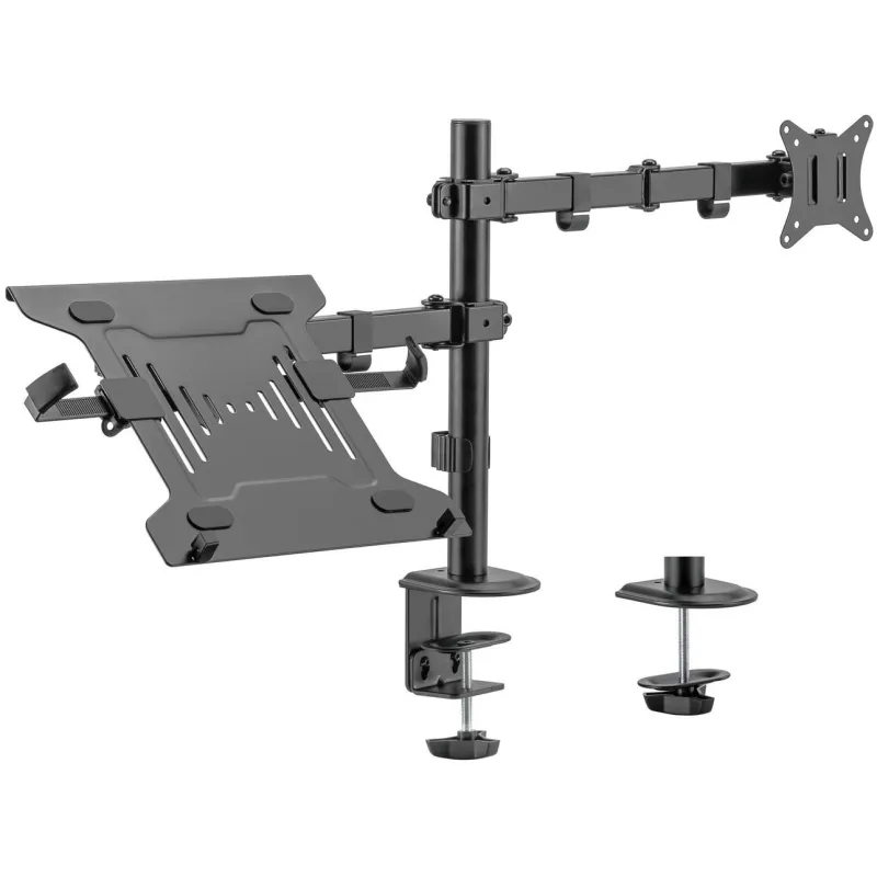Este soporte de mesa para portátil y monitor/TV es una solución versátil y robusta para cualquier entorno de trabajo. Diseñado para pantallas de tamaño mínimo de 17" (43,2 cm) y un tamaño máximo de 32" (81,3 cm), puede llevar un peso de hasta 9 kg por display. La instalación es sencilla y se puede realizar mediante abrazadera o atornillado, lo que lo hace idóneo para TV y compatible con interfaces de montaje de 75 x 75 mm y 100 x 100 mm. Permite la instalación de una sola pantalla y está diseñado para montaje en escritorio.
