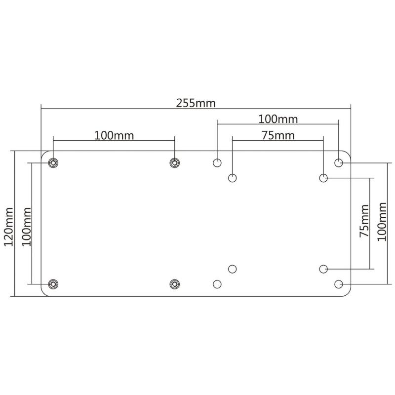 Las dimensiones del soporte son 255 mm de ancho y 120 mm de altura, proporcionando una estructura compacta y estable para tu mini PC.