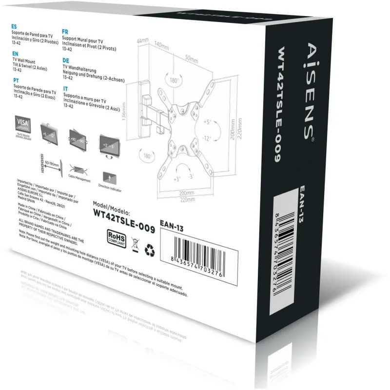 AISENS® – Soporte eco giratorio, inclinable y nivelable para monitor/TV 20kg (2 pivotes) de 13”-42”. Fabricado con acero de alta resistencia y pintado con pintura electrostática para un acabado perfecto.