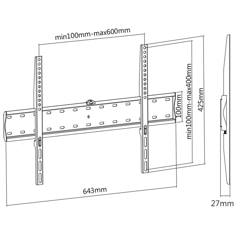 Diseñado para una experiencia ergonómica óptima, este soporte incluye un nivel integrado que facilita la instalación precisa. El paquete incluye un manual de usuario y un kit de montaje para una instalación sin complicaciones. Las dimensiones del soporte son compactas, con un ancho de 643 mm, una profundidad máxima de 2,7 cm y una altura de 425 mm, asegurando una instalación discreta y eficiente.