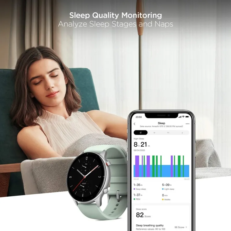 MONITOREO DE LA CALIDAD DEL SUEÑO PARA UN RENDIMIENTO ÓPTIMO: El GTR 2e ofrece un monitoreo profundo del sueño, que puede diferenciar con precisión entre los períodos de sueño profundo y REM, controlar la condición de respiración del sueño, proporcionar análisis de calidad y sugerencias para mejorar basadas en una noche de sueño, y reconocer siestas diurnas durante 20 minutos.