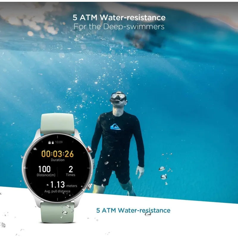 RESISTENTE Y VERSÁTIL, A LA ALTURA DE TUS AVENTURAS: Sumérgete sin preocupaciones con la resistencia al agua 5 ATM. Diseñado para acompañarte en todas tus actividades, desde correr bajo la lluvia hasta nadar en aguas abiertas. Este compañero resistente y versátil se adapta a tu estilo de vida activo y audaz.