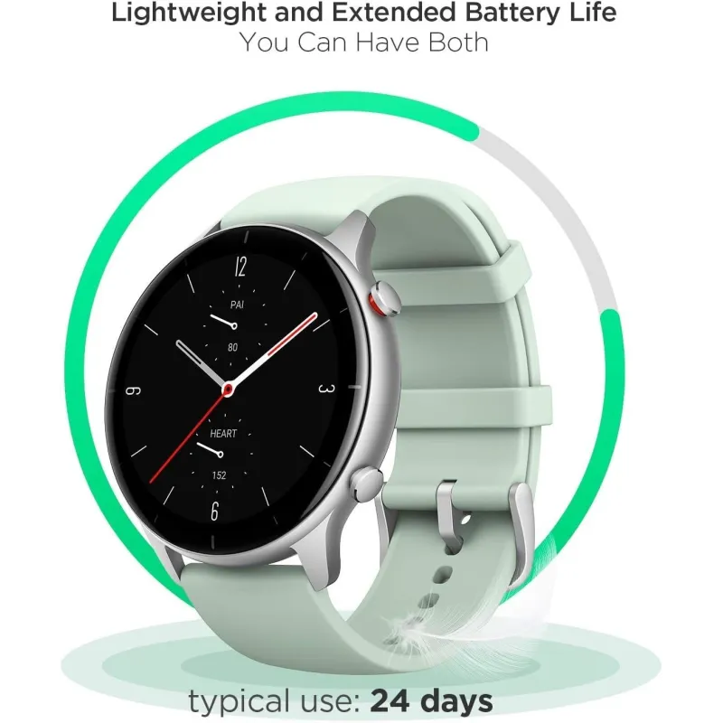 VIDA ÚTIL DE LA BATERÍA LIGERA Y EXTENDIDA: Con un diseño de circuito más sofisticado, un cuerpo más delgado y una batería de alta capacidad, el GTR 2e cuenta con una duración prolongada de la batería que le permite pasar hasta 24 días de actividad con el uso típico.