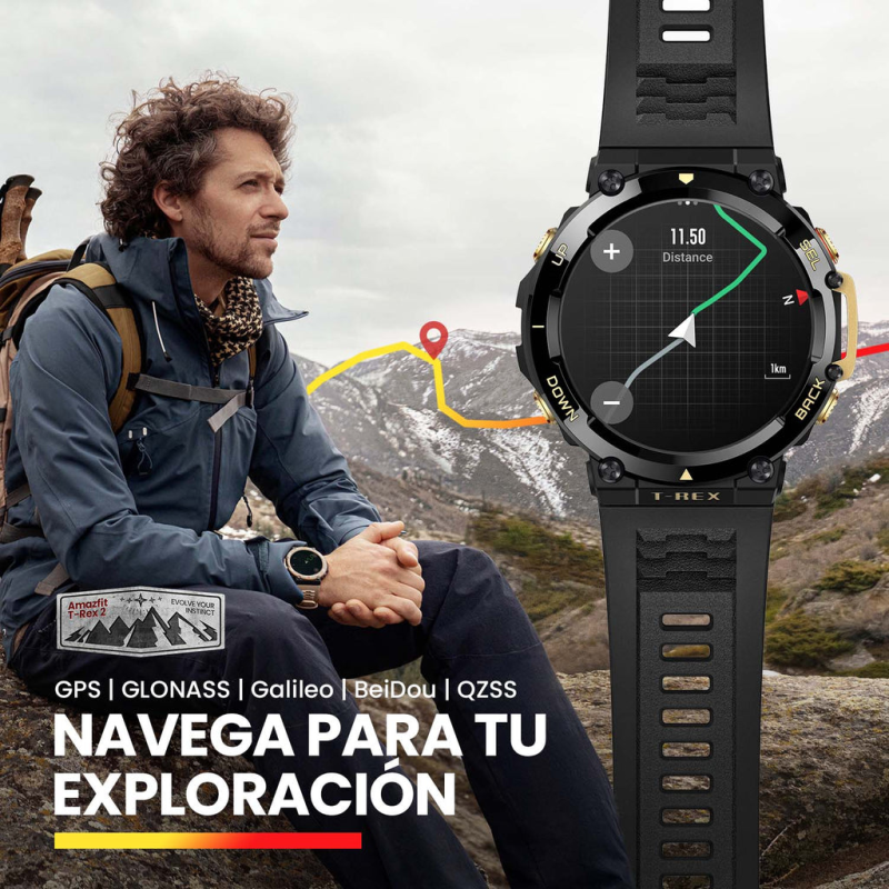 AMAZFIT T-REX 2. ROBUSTO RELOJ INTELIGENTE CON GPS PARA EXTERIORES: Posicionamiento de doble banda y 6 satélites | Funcionamiento a temperatura ultrabaja. Importación de rutas y navegación* | Dureza de grado militar | Duración de la batería de 24 días