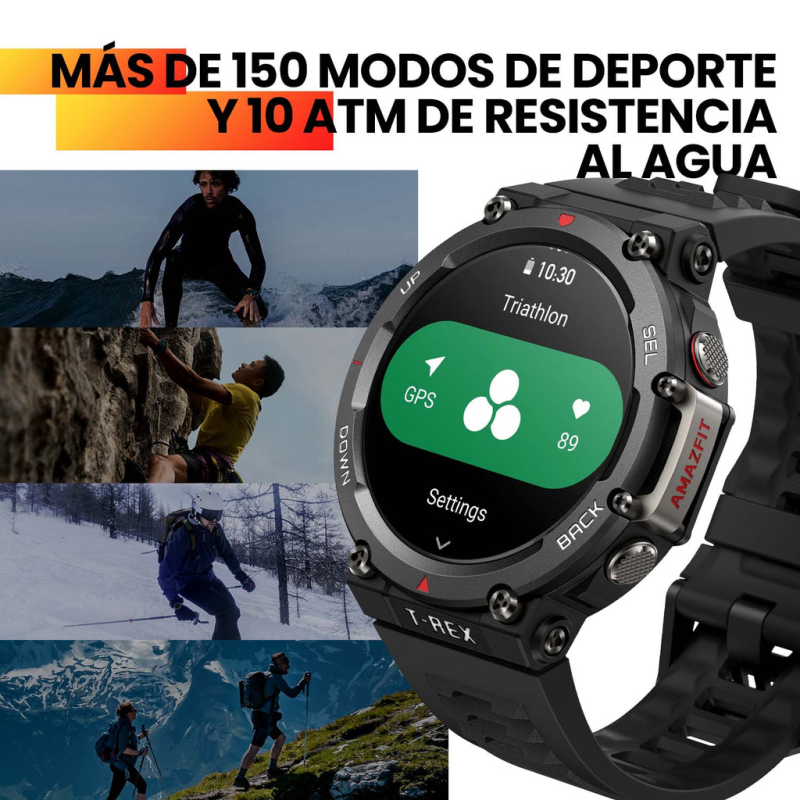 DESATA TU IMAGINACIÓN CON MÁS DE 150 MODOS DEPORTIVOS INTEGRADOS: La enorme selección de más de 150 modos deportivos del Amazfit T-Rex 2 incluye el modo de triatlón de prueba de resistencia, el modo profesional de carrera en pista con grabación de datos de vuelta con corrección de trayectoria inteligente y el modo de swing de golf más pausado. Sea cual sea la actividad que te motive, lo más probable es que encuentres un modo a su medida en el T-Rex 2.