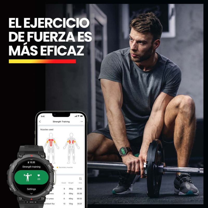 RECONOCIMIENTO DE EJERCICIOS DE FUERZA; ENTRENA A LA BESTIA QUE LLEVAS DENTRO: El Amazfit T-Rex 2 puede reconocer automáticamente los movimientos y contar las repeticiones de decenas* de tipos de ejercicios de entrenamiento de fuerza, muchos de los cuales tienen variaciones que se pueden ajustar en la aplicación Zepp, además de un seguimiento de tu tiempo de descanso entre series para que tu entrenamiento sea eficaz. Cuando termine el entrenamiento, podrás ver en la aplicación Zepp el grupo de músculos que ejercitase y por cuánto tiempo, para asegurarte de que trabajase los músculos deseados durante el tiempo suficiente.