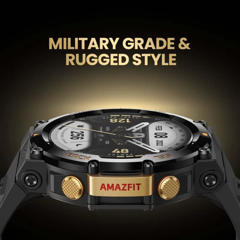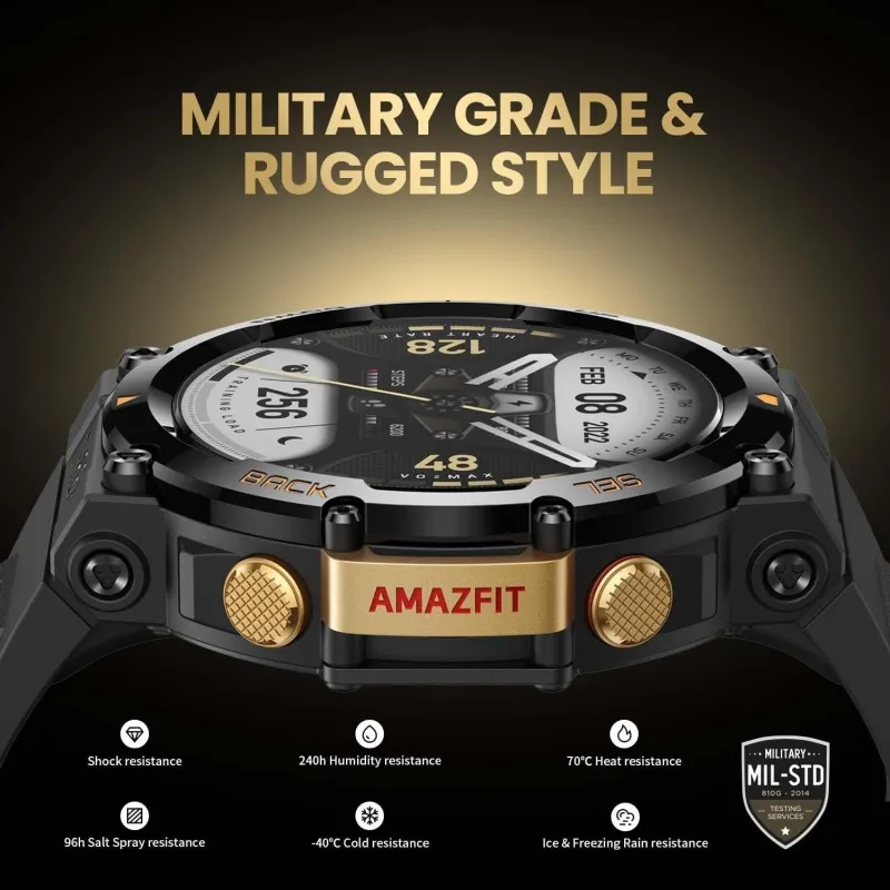 SUPER RESISTENTE DESDE EL INTERIOR: Experimenta la emoción de la caza con el rey de la dureza que es el Amazfit T-Rex 2. El reloj ha pasado 15 pruebas de categoría militar1 para demostrar que puede llevarlo puesto en entornos difíciles en senderos a través de selvas tropicales húmedas, al subir o bajar montañas en temperaturas heladas.