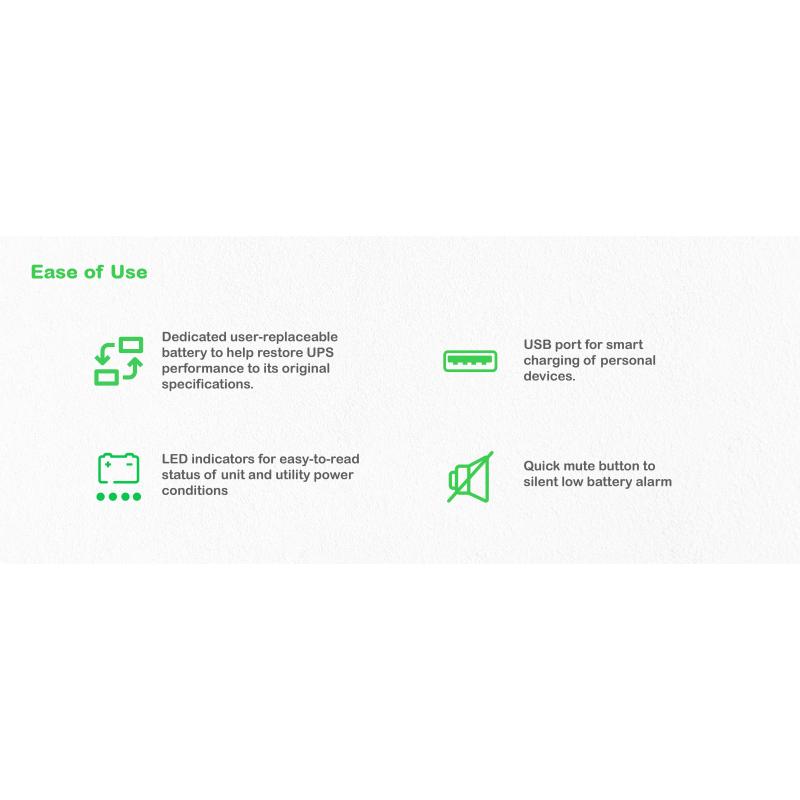 PROTECCIÓN DE ENERGÍA Y SOBRETENSIÓN PARA TUS DISPOSITIVOS: Este APC Back-UPS ofrece protección de energía y sobretensión para redes inalámbricas, computadoras, consolas de videojuegos y otros dispositivos electrónicos en tu hogar o negocio. El UPS de 500VA para montaje en suelo o pared tiene un total de 8 tomas, 6 de las cuales son de respaldo de batería y protección contra sobretensiones, y 2 que son solo de protección contra sobretensiones. Tiene una clasificación de energía de sobretensión de 310 Joules. Cuenta con un puerto USB para carga inteligente de dispositivos personales. Este UPS tiene una garantía de 2 años en la unidad y la batería. Garantía de 3 años, política de protección de equipos conectados de por vida de €100,000, y soporte técnico gratuito exclusivo para países de la comunidad europea. Es compatible con una batería reemplazable por el usuario, y el cartucho de batería de reemplazo APC ayuda a restaurar el rendimiento del UPS a las especificaciones originales.