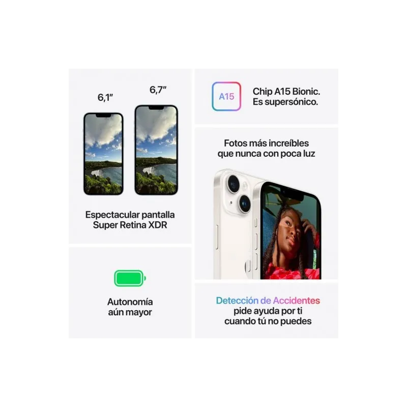 POTENCIA Y VELOCIDAD REVOLUCIONARIAS: El chip A15 Bionic con CPU de 6 núcleos y GPU de 5 núcleos redefine las fronteras del rendimiento y la eficiencia. El Neural Engine de 16 núcleos despliega un universo de posibilidades en aprendizaje automático, haciendo que cada tarea sea más rápida y personalizada. Con 128 GB de capacidad, la velocidad y el espacio dejan de ser una barrera.