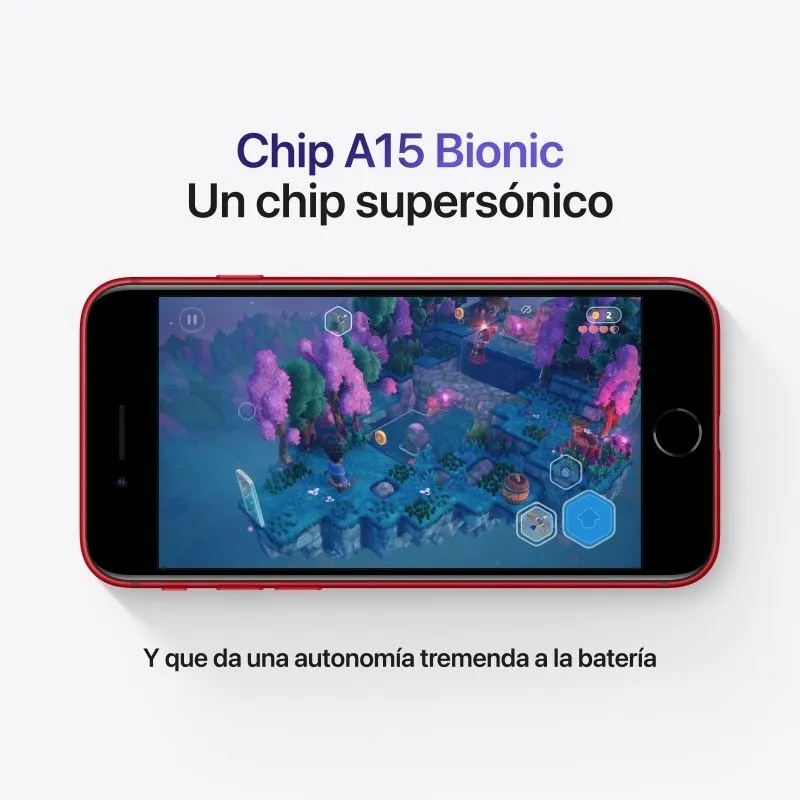 LA RAPIDEZ LE VIENE DE FAMILIA: El iPhone SE y el iPhone 13 comparten el chip A15 Bionic. Agárrate fuerte. Todo va gas a fondo con el chip A15 Bionic. Las apps se cargan en un pispás y funcionan con absoluta fluidez. Y eso no es todo, amigos. El rendimiento gráfico de los juegos solo tiene un nombre: bestial.