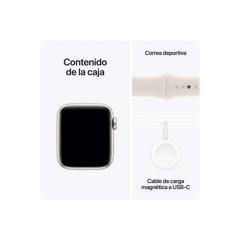 DISEÑO FUNCIONAL Y RESISTENTE PARA EL USO DIARIO: El Smartwatch Apple Watch SE MXGK3QL/A destaca por su diseño rectangular de 40 mm con cuerpo de aluminio y correa de caucho en color beige. Esta combinación no solo resulta elegante, sino también cómoda para un uso prolongado. Es resistente al agua hasta 50 metros, lo que lo hace ideal para nadar, correr bajo la lluvia o practicar deportes acuáticos. Además, su correa extraíble permite personalizar el estilo según las preferencias del usuario. La inclusión de un conector de carga magnética y cargador inalámbrico facilita su uso diario, mientras que su tamaño ajustable para muñecas de 130 a 200 mm lo hace versátil para distintos usuarios. El Smartwatch Apple Watch SE MXGK3QL/A es la elección perfecta para quienes buscan un wearable duradero, práctico y con un diseño moderno.