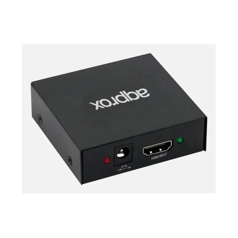 Splitter Approx APPC30V3 con versión HDMI 1.4b, soporta resolución 3860 x 2160, velocidad de 30 Hz, HDCP y dos puertos HDMI con indicador LED