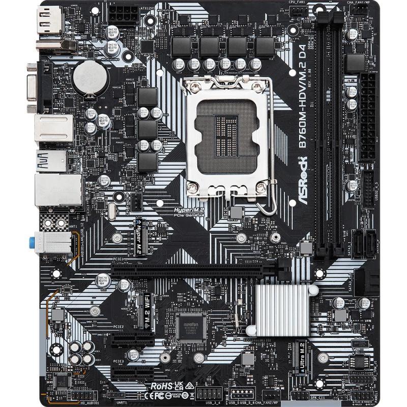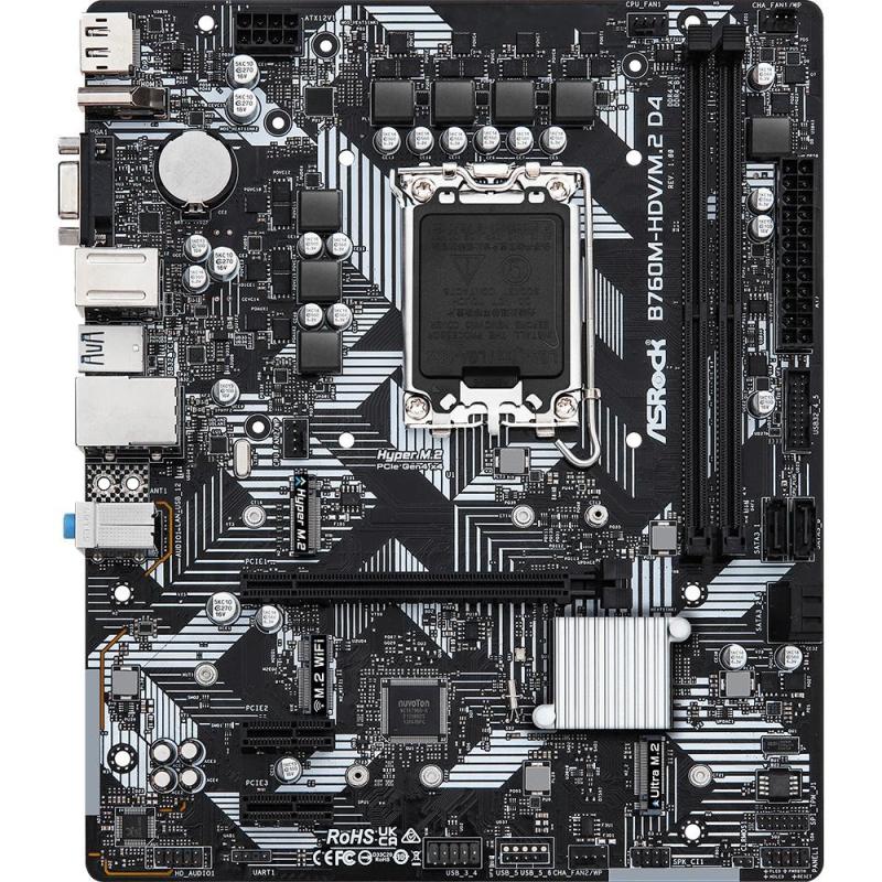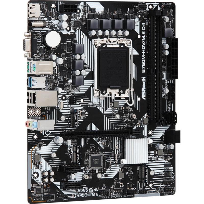 El chipset Intel B760 y el chip de sonido Realtek ALC897 ofrecen una calidad de audio de 7.1 canales, ideal para una inmersión total en juegos y multimedia. La placa, de factor de forma micro ATX, es compatible con los sistemas operativos Windows 10 Education x64 y Windows 11 x64, y cumple con las certificaciones FCC y CE. Las ranuras de expansión incluyen PCI Express x1 (Gen 3.x) y x16 (Gen 4.x), además de una ranura M.2 (M), lo que la hace ideal para futuras actualizaciones y expansión.