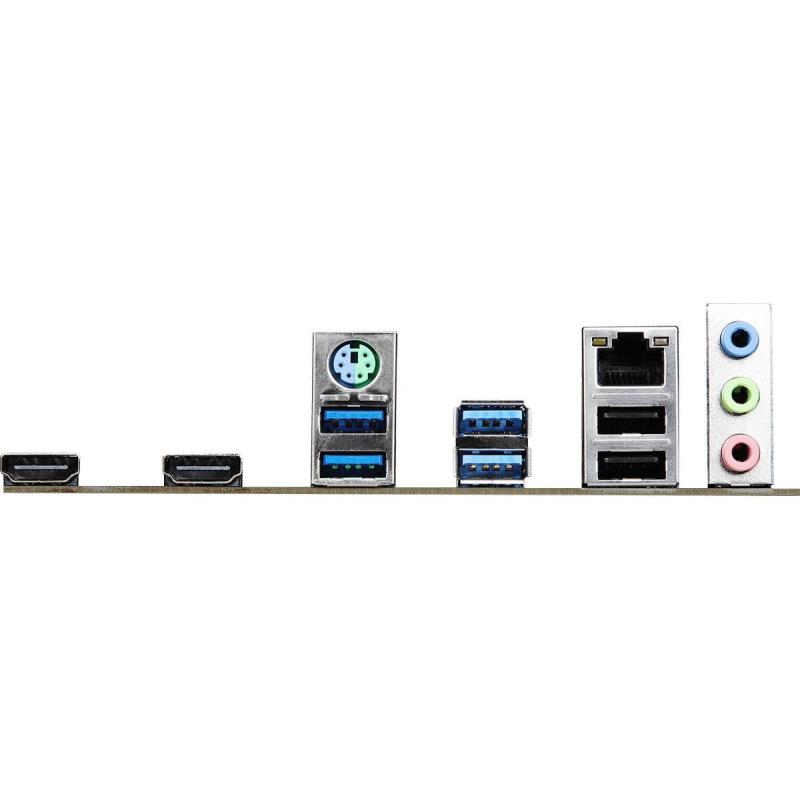 La conectividad incluye Gigabit Ethernet con el controlador Realtek RTL8111H, junto con 4 puertos USB 3.2 Gen 1 y 2 puertos USB 2.0 en el panel trasero. También cuenta con 2 puertos HDMI, salida de audio de 7.1 canales y conectores para micrófono y entrada de línea.