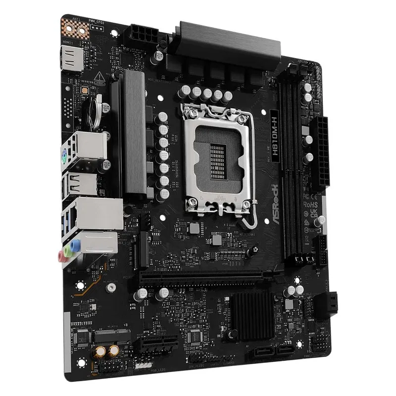Placa base ASRock H810M-H  micro-ATX con socket LGA1851, DDR5, M.2 PCIe 4.0, 4× SATA, HDMI/DP, USB 3.2 Gen1 y LAN Gigabit. Compatible con Intel Core Ultra.