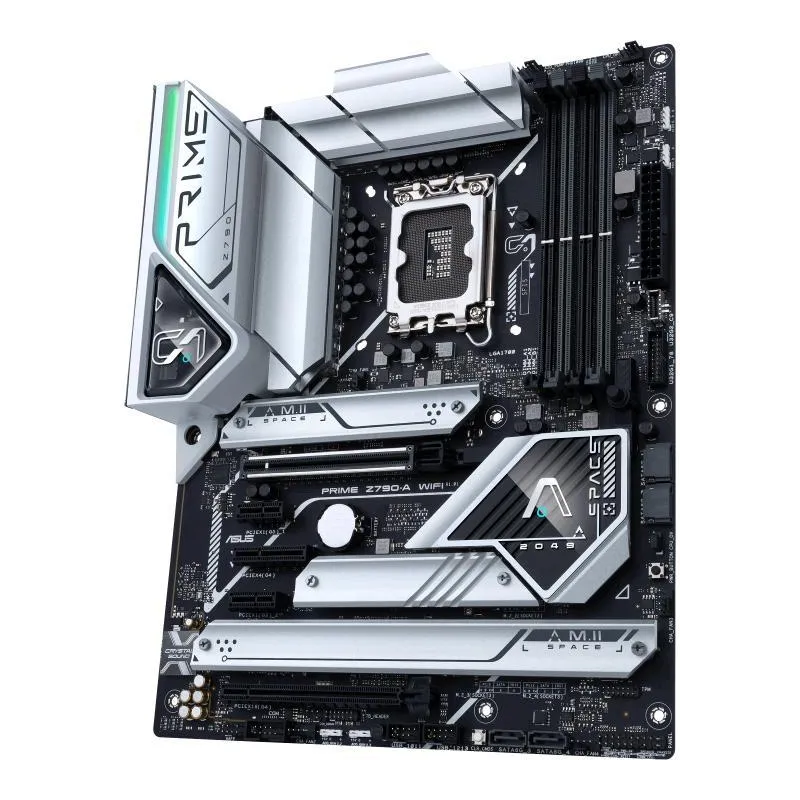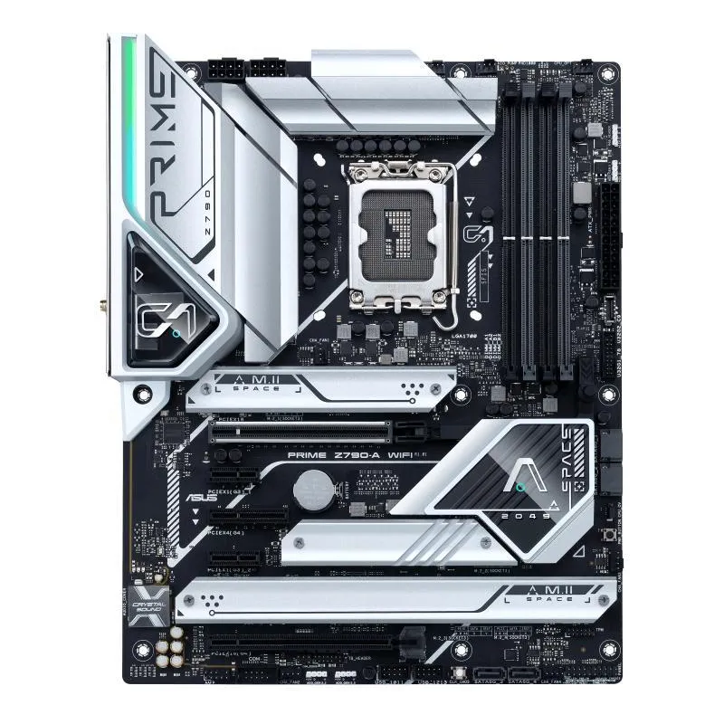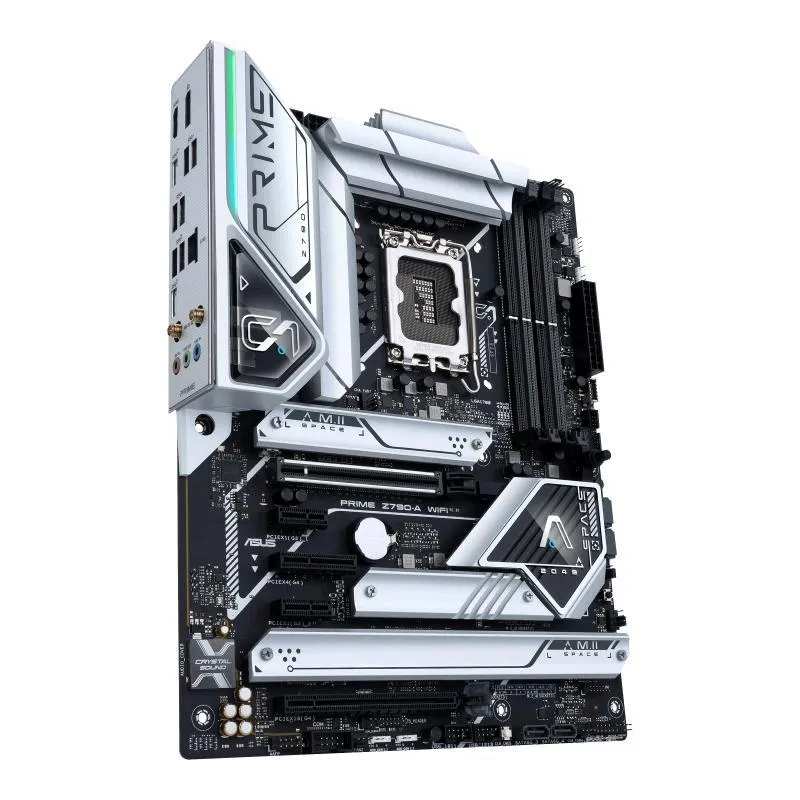 La ASUS PRIME Z790-A WIFI ofrece todo esto en un paquete elegante y futurista centrado en una estética de diseño de nave espacial, con una placa de identificación y una cubierta de chipset en tono plateado.