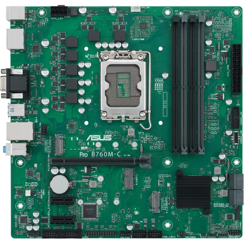 Placa Base Asus PRO B760M-C-CSM con chipset Intel B760, soporte para memoria DDR5 6200 MHz y múltiples opciones de conectividad y expansión