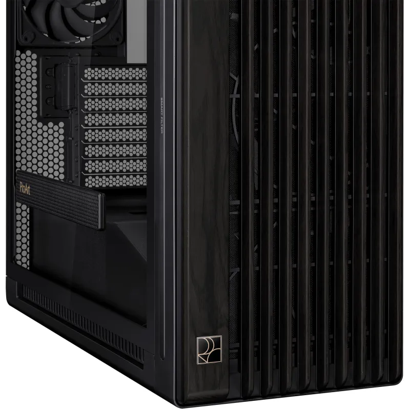 DISEÑO ELEGANTE CON PANEL DE VIDRIO TEMPLADO: Esta Torre Asus ProArt PA602 Wood Edition incorpora un sofisticado panel de vidrio templado que no solo mejora la estética del equipo, sino que también permite una visión clara del interior, ideal para quienes valoran tanto el diseño como la funcionalidad. Este panel resalta los componentes internos y ofrece un acceso visual cómodo para supervisar el sistema. Además, la estructura de madera y el acabado negro aportan un estilo moderno y distintivo. La Torre Asus ProArt PA602 Wood Edition se adapta a múltiples formatos de placa base, ofreciendo una compatibilidad amplia sin comprometer el diseño. La inclusión de elementos como la gestión de cables y el filtro anti-polvo contribuyen a mantener el interior limpio y ordenado, optimizando el flujo de aire y la refrigeración del sistema. Todo ello sin perder el enfoque en la estética que proporciona el panel de vidrio templado.