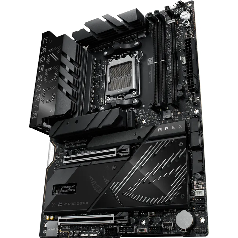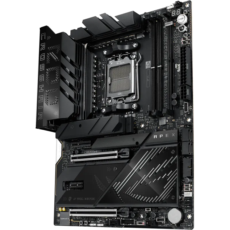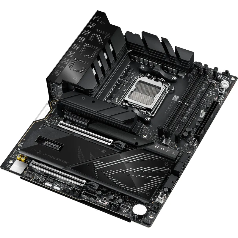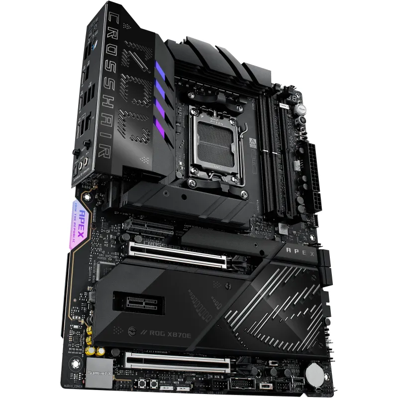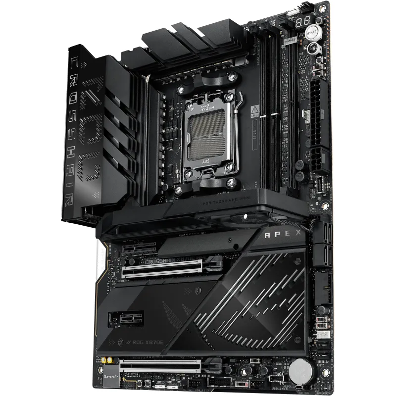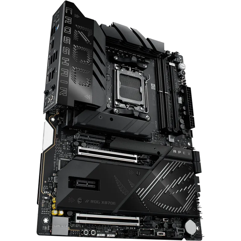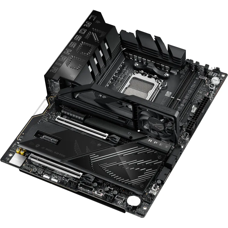 ROG CROSSHAIR X870E APEX: La ROG Crosshair X870E Apex, lista para IA, está diseñada para el overclocking de récord mundial, gracias a sus extensas características de BIOS y la refrigeración exótica del kit de ventilador de memoria exclusivo de ROG. Más allá de su destreza en el overclocking, ofrece un soporte integral para tarjetas gráficas y almacenamiento de última generación, convirtiéndola en la plataforma definitiva para los entusiastas del rendimiento de AM5 AMD Ryzen™.