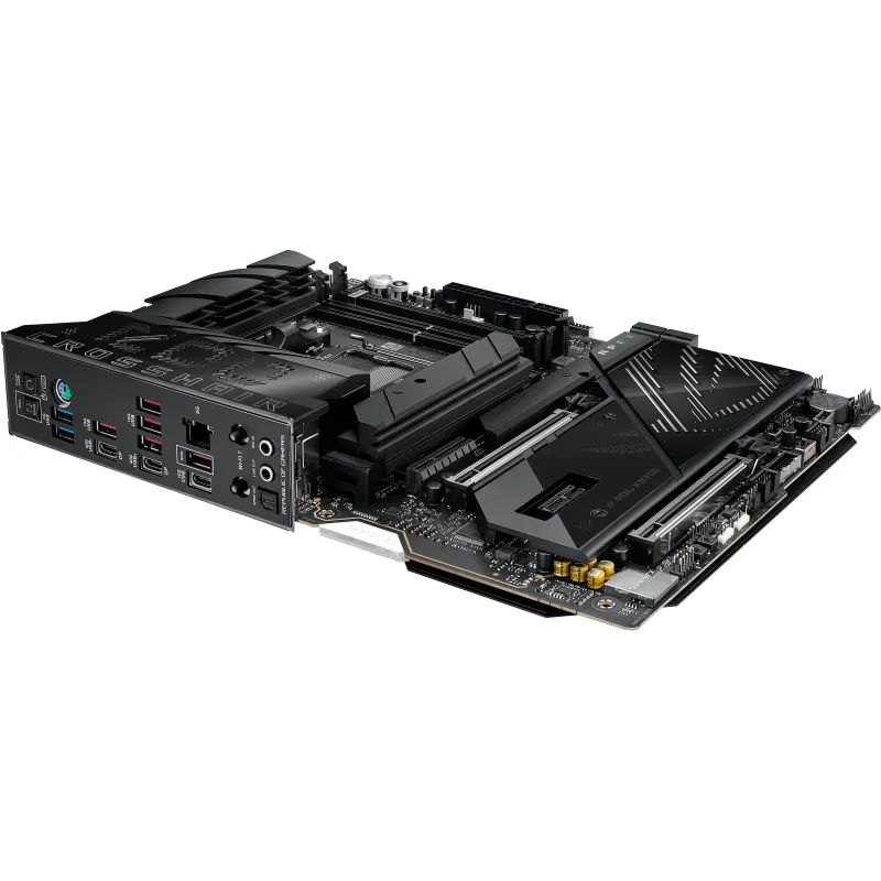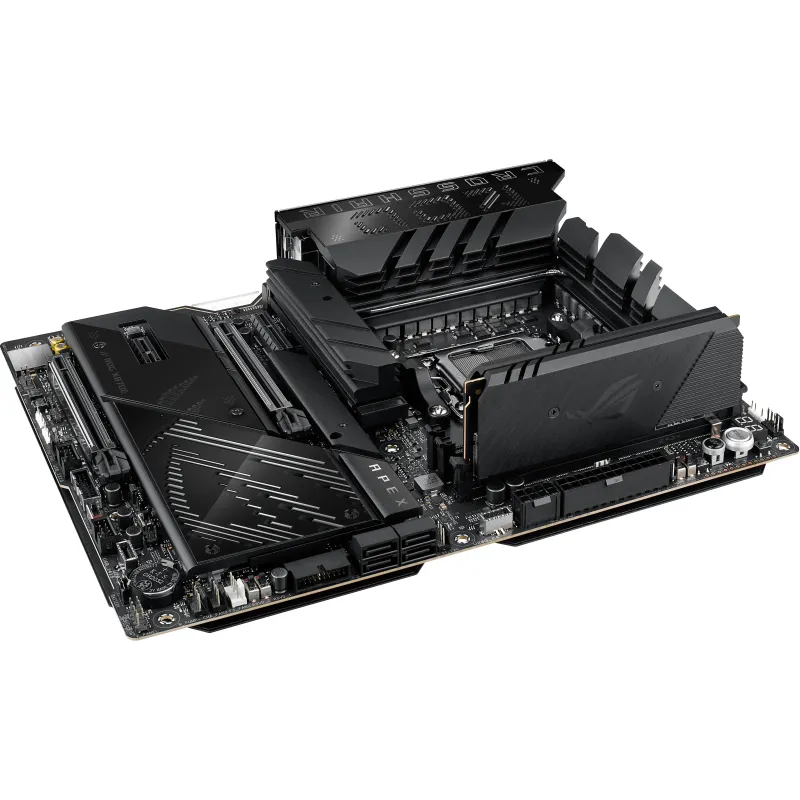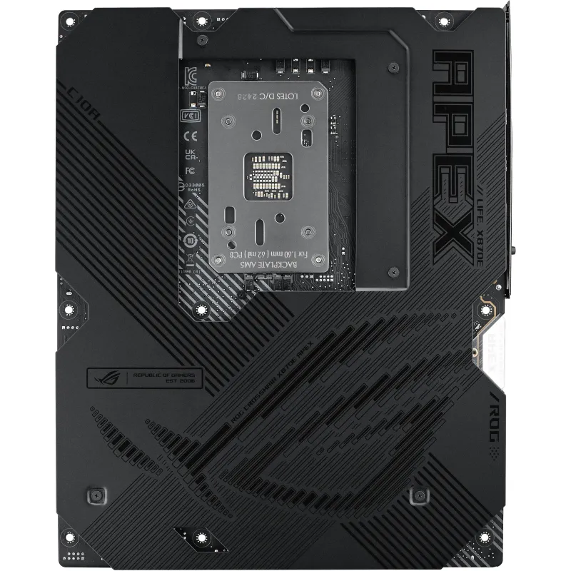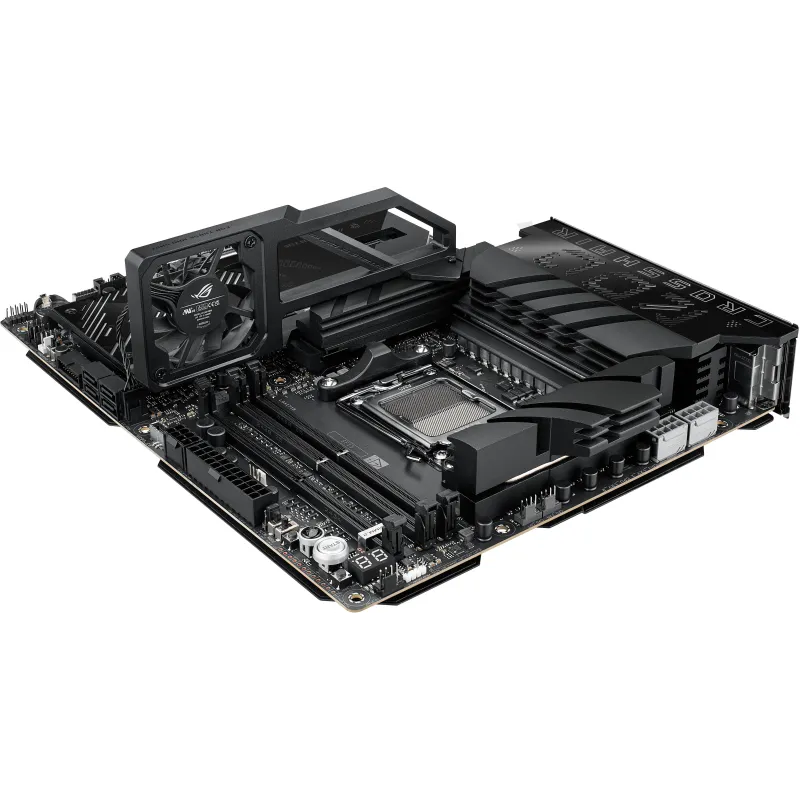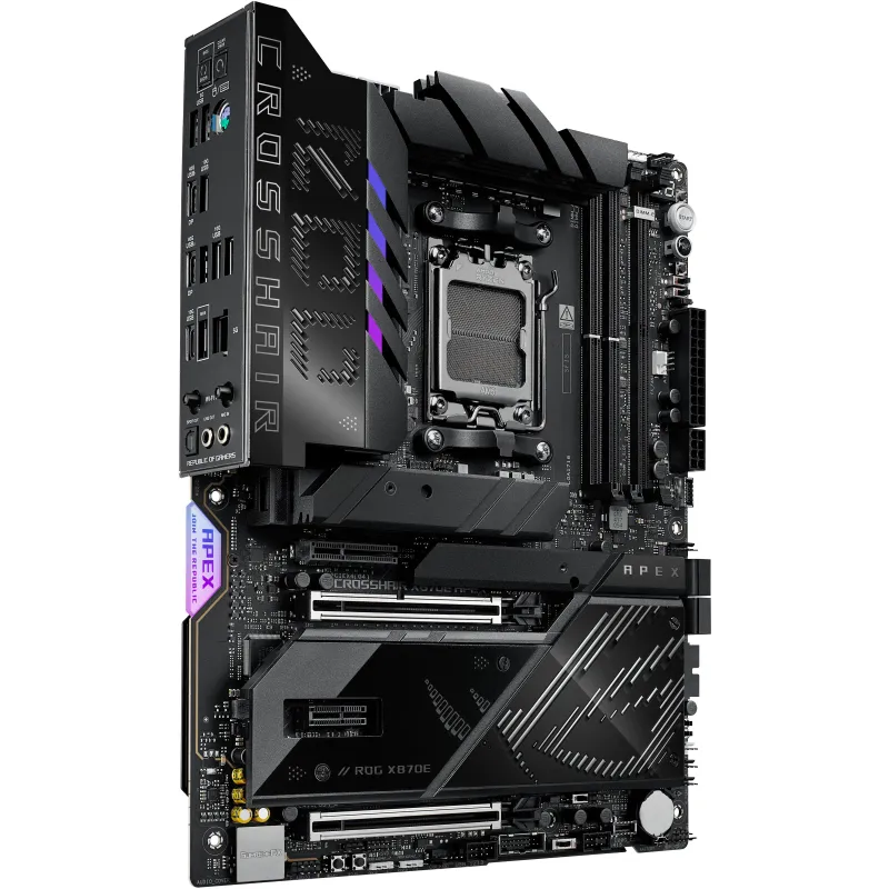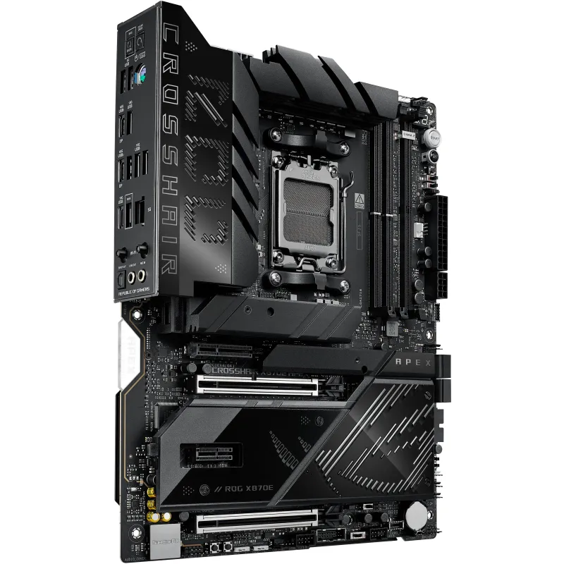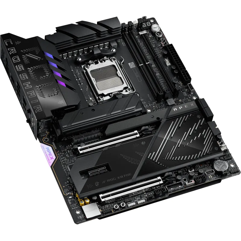 ROG CROSSHAIR X870E APEX: La ROG Crosshair X870E Apex, lista para IA, está diseñada para el overclocking de récord mundial, gracias a sus extensas características de BIOS y la refrigeración exótica del kit de ventilador de memoria exclusivo de ROG. Más allá de su destreza en el overclocking, ofrece un soporte integral para tarjetas gráficas y almacenamiento de última generación, convirtiéndola en la plataforma definitiva para los entusiastas del rendimiento de AM5 AMD Ryzen™.