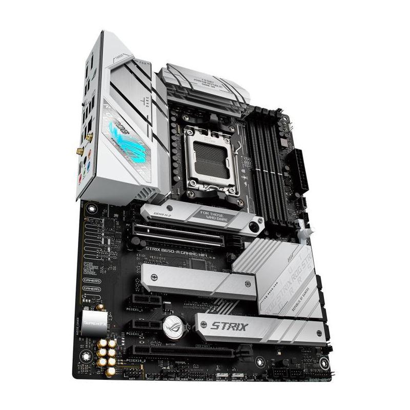 ROG STRIX B650-A GAMING WIFI: El ROG Strix B650-A Gaming WiFi viene equipado con un potente rendimiento y destreza térmica en un paquete de aspecto fresco. La entrega de energía robusta, diseñada para manejar los últimos procesadores AMD Ryzen™ Serie 7000, se enfría con disipadores de calor de metal grueso que destacan contra un PCB negro. Una ranura PCIe 5.0 M.2, soporte para memoria DDR5 rápida y la última red WiFi 6E completan el conjunto de características futuristas.