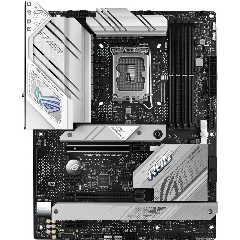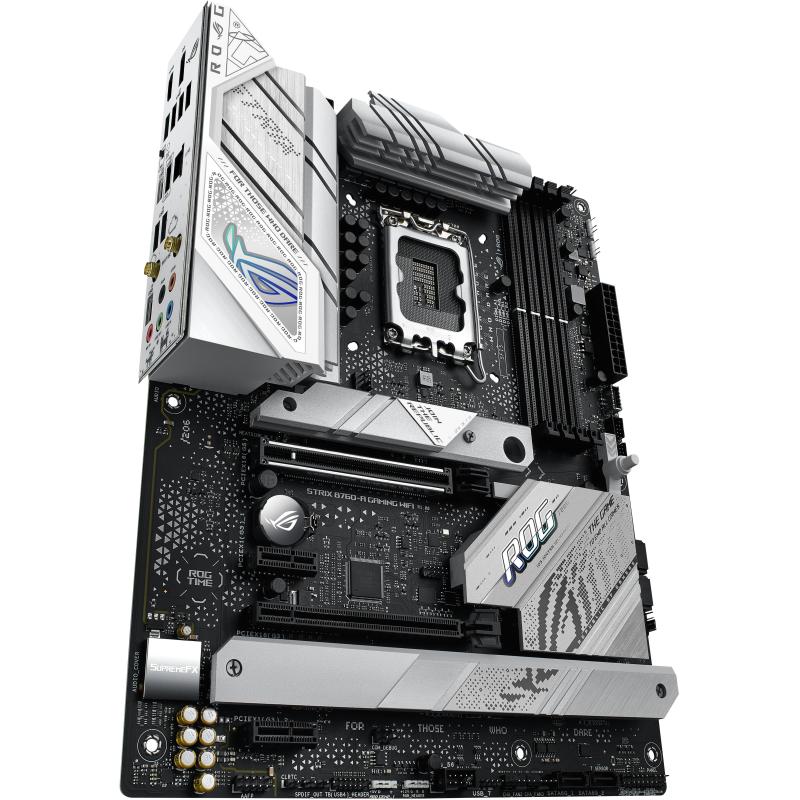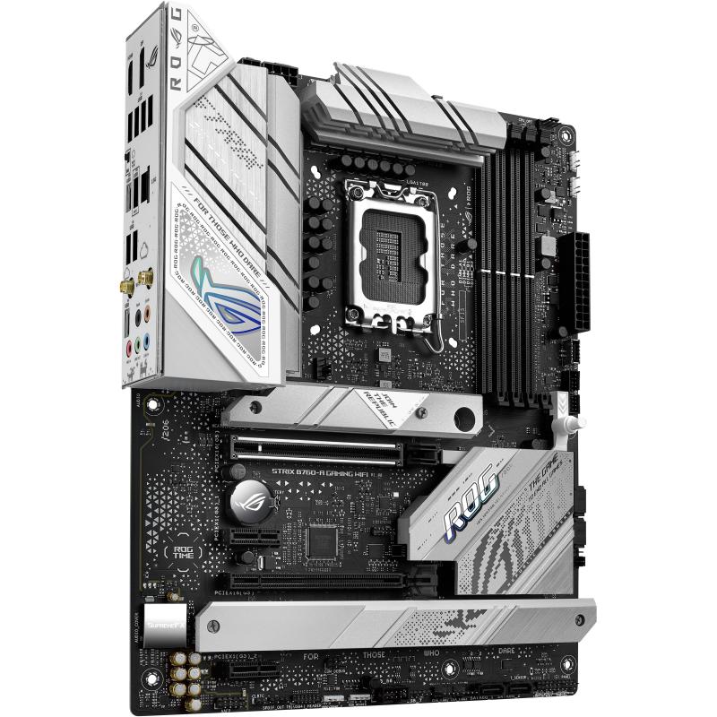 ROG STRIX B760-A GAMING WIFI: Al igual que su formidable hermano, el ROG Strix B760-A Gaming WiFi ofrece una vibrante interpretación de la última plataforma Intel, con PCIE 5.0, USB 3.2 GEN 2x2 y motivos ROG inspirados en el ciberespacio estampados en un fondo de alto contraste. Pero esta variante cuenta con DDR5, aportando aún más ancho de banda para juegos y aplicaciones.