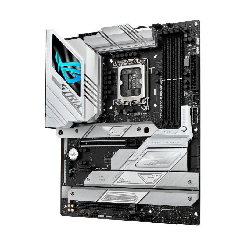 INDUDABLEMENTE ROG STRIX: La ROG Strix Z790-A II abraza audazmente la luz, para una interpretación alternativa de los temas de construcción a su hermano oscuro y sombrío, el Strix Z790-F. Los disipadores de calor metálicos plateados destacan contra un fondo de PCB oscuro y llaman la atención sobre la alta capacidad de gestión térmica de la placa. Una capa transparente en el escudo de E/S añade un toque único y enfatiza el logotipo RGB personalizable debajo. Todo el diseño se une con detalles centrados en ROG en la placa, los disipadores de calor y el escudo de E/S para una perspectiva vibrante y futurista. Combina la Strix Z790-A II con otros productos del diverso ecosistema ROG para crear una configuración de juego totalmente personalizada que refleje tu estilo personal.