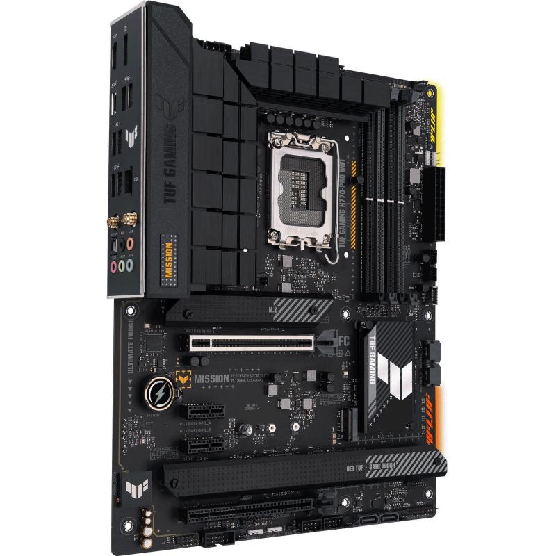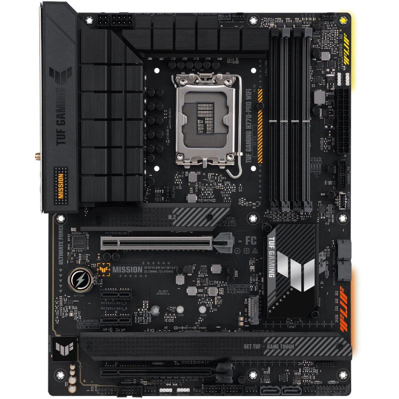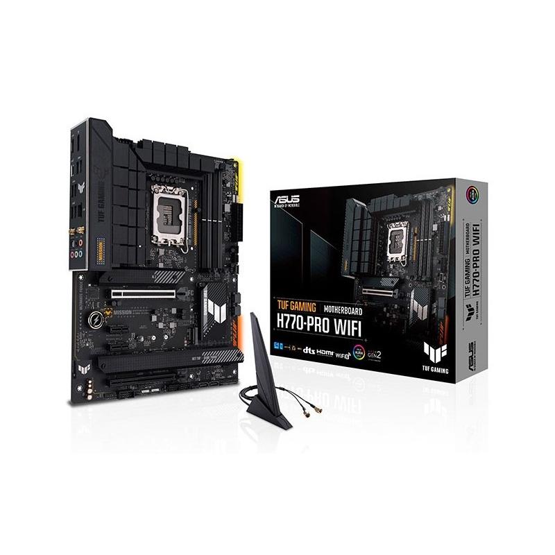 TUF GAMING H770-PRO WIFI toma todos los elementos esenciales de los últimos procesadores Intel® y los combina con características listas para el juego y durabilidad comprobada. Diseñada con componentes de grado militar, una solución de energía mejorada y un sistema de enfriamiento integral, esta placa base supera las expectativas con un rendimiento sólido como una roca para juegos de maratón. Las placas base TUF GAMING también se someten a rigurosas pruebas de resistencia para garantizar que puedan manejar condiciones donde otras pueden fallar. Estéticamente, este modelo incorpora una placa de identificación en relieve y elementos de diseño geométrico para reflejar la confiabilidad y estabilidad que define la serie TUF GAMING.