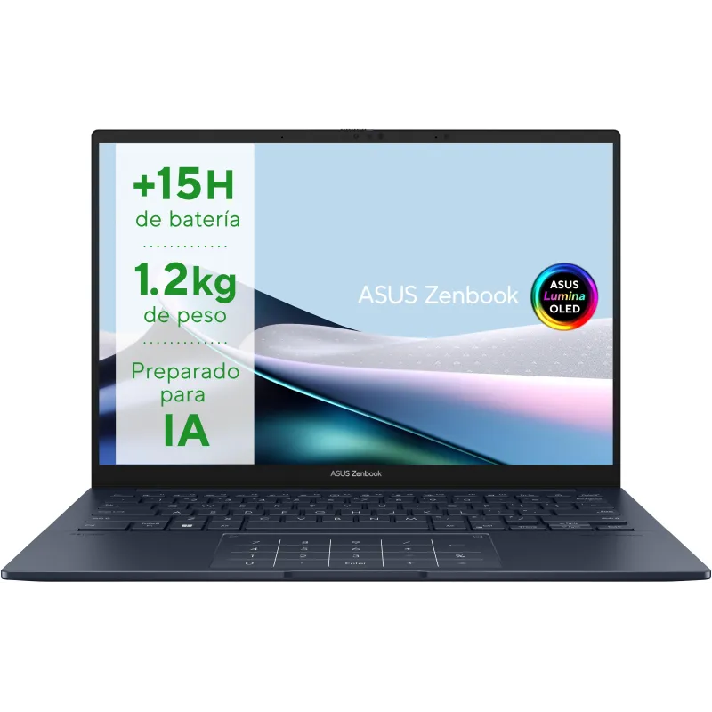 PORTÁTIL. COLORIDO. CON IA.: Da un paso más con el Zenbook 14 OLED, el ordenador ultraportátil definitivo increíblemente elegante que lleva la sofisticación a un nivel completamente nuevo. Este artesanal ordenador portátil de gama alta llevará el trabajo y el entretenimiento a otro nivel gracias a su rendimiento, fabricación y durabilidad. Aprovecha este portátil exclusivo, duro y confiable y exprime cada momento con la batería de larga duración mejorada, aumenta tu eficiencia con el procesador de primera categoría Intel® Core™ Ultra de la serie 1 y los gráficos Intel Arc™ y consigue la conectividad perfecta con todos los puertos esenciales. Sumerge tus sentidos en la vívida pantalla táctil ASUS Lumina OLED12 y los nuevos y potentes altavoces superlineales, al tiempo que adoptas la elegancia ecológica del diseño amable y sustentable que apuesta por la equidad, reduce el impacto ambiental, reutiliza los materiales de fabricación, minimiza su marca de carbono y te ayuda a eliminar los restos de basura para proteger el hábitat en el que vivimos y cuidar del ecosistema.