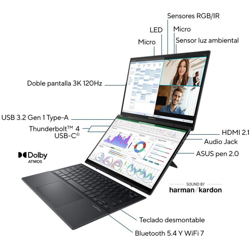 DOBLA TU APUESTA: El ASUS Zenbook DUO es un portátil revolucionario de pantalla doble. Este increíble ordenador, que personifica la innovación CES 2024, incorpora dos pantallas táctiles OLED de tamaño completo1, teclado desmontable de tamaño completo y soporte integrado. Es el portátil definitivo que combina a la perfección la versatilidad de la multitarea con una excelente movilidad. Con estas las dos pantallas táctiles OLED 3K de 14 pulgadas a 120 Hz, puedes ampliar al instante tu espacio de trabajo hasta 19,8 pulgadas. El ASUS Zenbook DUO cuenta con un procesador Intel® Core™ Ultra 9 potenciado por IA y memoria LPDDR5x de 32 GB. Además, viene equipado con SSD PCIe® 4.0 de hasta 2 TB. Es un portátil que te garantiza un rendimiento excepcional en todo momento para que puedas con todo. Incorpora software inteligente dedicado, control intuitivo por gestos y una batería de 75 Wh de duración mejorada. Todo ello convierte al Zenbook DUO en un portátil ASUS fácil de usar que maximiza la productividad sin complicaciones. Vamos, ¡dobla tu apuesta!