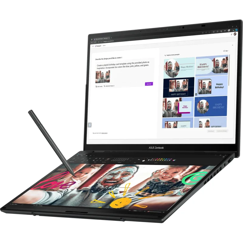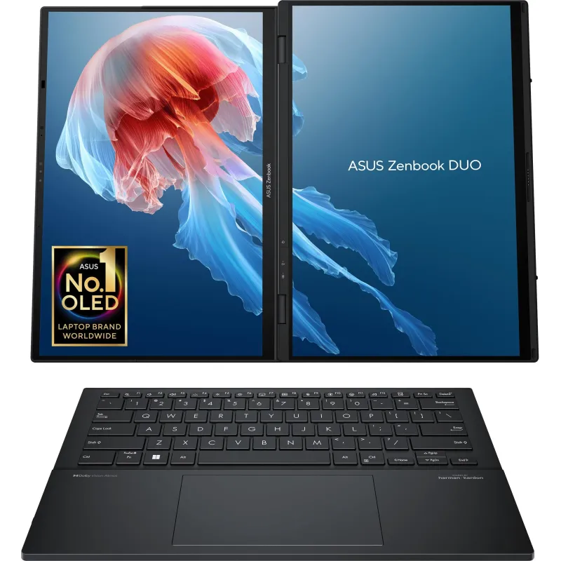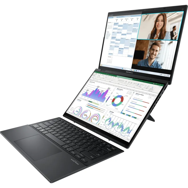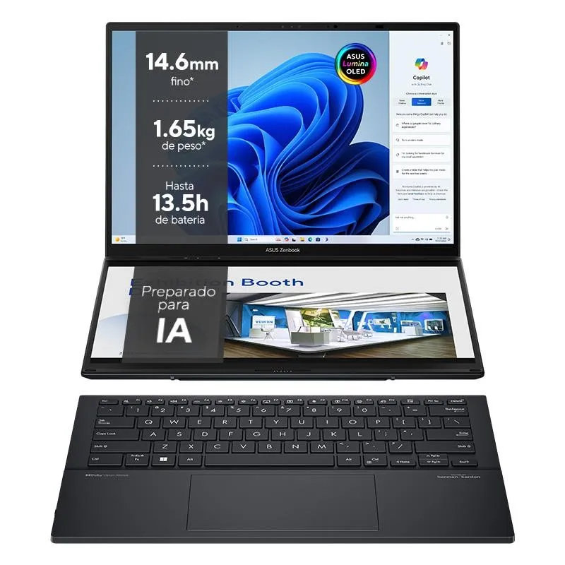 El ASUS Zenbook DUO es un portátil revolucionario de pantalla doble. Este increíble ordenador, que personifica la innovación CES 2024, incorpora dos pantallas táctiles OLED de tamaño completo, teclado desmontable de tamaño completo y soporte integrado. Es el portátil definitivo que combina a la perfección la versatilidad de la multitarea con una excelente movilidad. Con estas las dos pantallas táctiles OLED 3K de 14 pulgadas a 120 Hz, puedes ampliar al instante tu espacio de trabajo hasta 19,8 pulgadas. El ASUS Zenbook DUO cuenta con un procesador Intel® Core™ Ultra 9 potenciado por IA y memoria LPDDR5x de 32 GB. Además, viene equipado con SSD PCIe® 4.0 de hasta 2 TB. Es un portátil que te garantiza un rendimiento excepcional en todo momento para que puedas con todo. Incorpora software inteligente dedicado, control intuitivo por gestos y una batería de 75 Wh de duración mejorada. Todo ello convierte al Zenbook DUO en un portátil ASUS fácil de usar que maximiza la productividad sin complicaciones. Vamos, ¡dobla tu apuesta!
