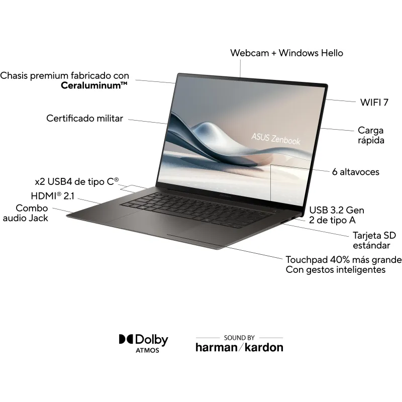 EXPERIENCIA MULTIMEDIA ENVOLVENTE CON AUDIO HARMAN KARDON: El Portátil Asus Zenbook S 16 OLED UM5606WA-RK320W Copilot+ PC incorpora un sistema de audio desarrollado por Harman Kardon con tecnología Smart Amp, que ofrece un sonido claro, potente y envolvente. Ya sea para videollamadas, ver películas o escuchar música, la calidad de audio es sobresaliente. Su cámara frontal Full HD con sensor infrarrojo permite videoconferencias nítidas y acceso seguro mediante reconocimiento facial gracias a Windows Hello. Estas características hacen del Zenbook S 16 una excelente opción para quienes buscan una experiencia multimedia completa y segura en todo momento.