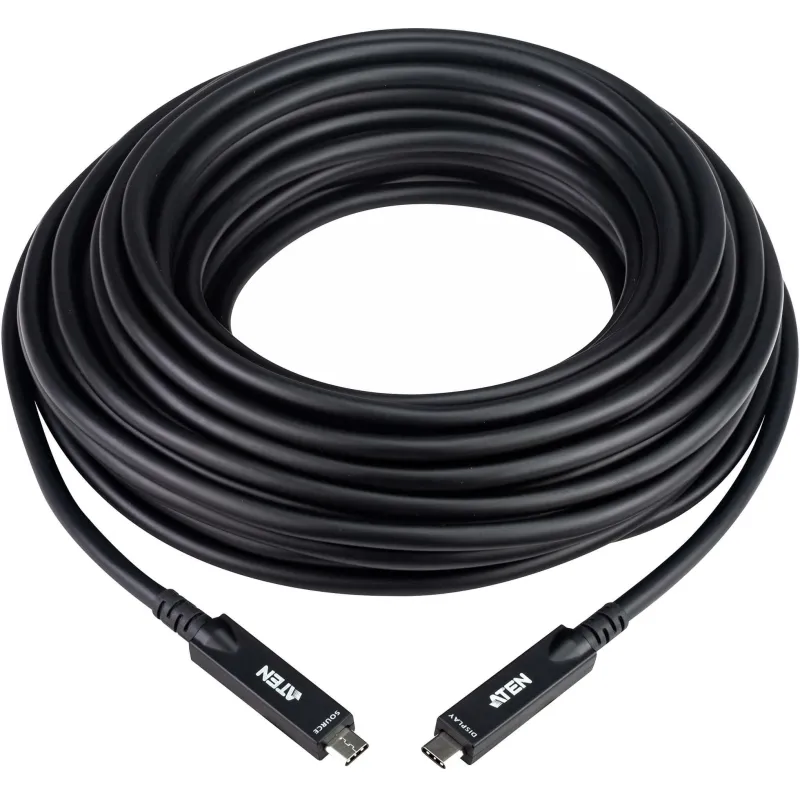 El ATEN UE3415F es un cable USB-C AOC (activo óptico) de 15 m: la opción sensata cuando necesitas llevar imagen por USB-C, datos y carga a distancia real de sala sin encadenar adaptadores ni extensores.