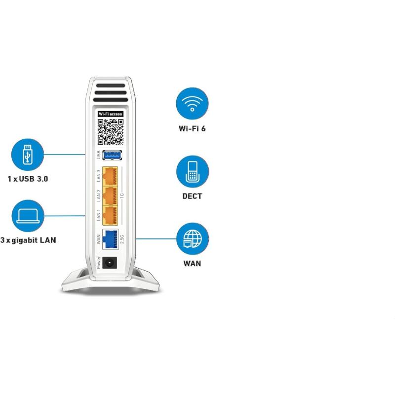 PARA UNA POTENTE RED LOCAL CON WI-FI 6 A TRAVÉS DE UN TERMINAL DE FIBRA ÓPTICA, CABLE MÓDEM O UN MÓDEM DSL: El FRITZ!Box 4060 es un router inalámbrico tribanda equipado con Wi-Fi 6 4x4, que incluye la función MIMO y Wi-Fi Mesh. El nuevo buque insignia de la serie 40 cuenta por primera vez con centralita VoIP integrada con base DECT, que permite utilizar dispositivos de domótica y telefonía. Además, un puerto WAN de 2,5 Gbps proporciona una conexión a Internet ultrarrápida mediante, por ejemplo, cable módem o un terminal de fibra óptica. El puerto WAN también se puede utilizar, si es necesario, como puerto LAN adicional de 2,5 Gbps. Con tres puertos Gigabit Ethernet, los ordenadores o dispositivos de red pueden integrarse en la red local a velocidad Gigabit. Además, en el FRITZ!Box 4060 están integrados un sistema de telefonía VoIP y un sistema NAS con una rápida conexión USB 3.0.