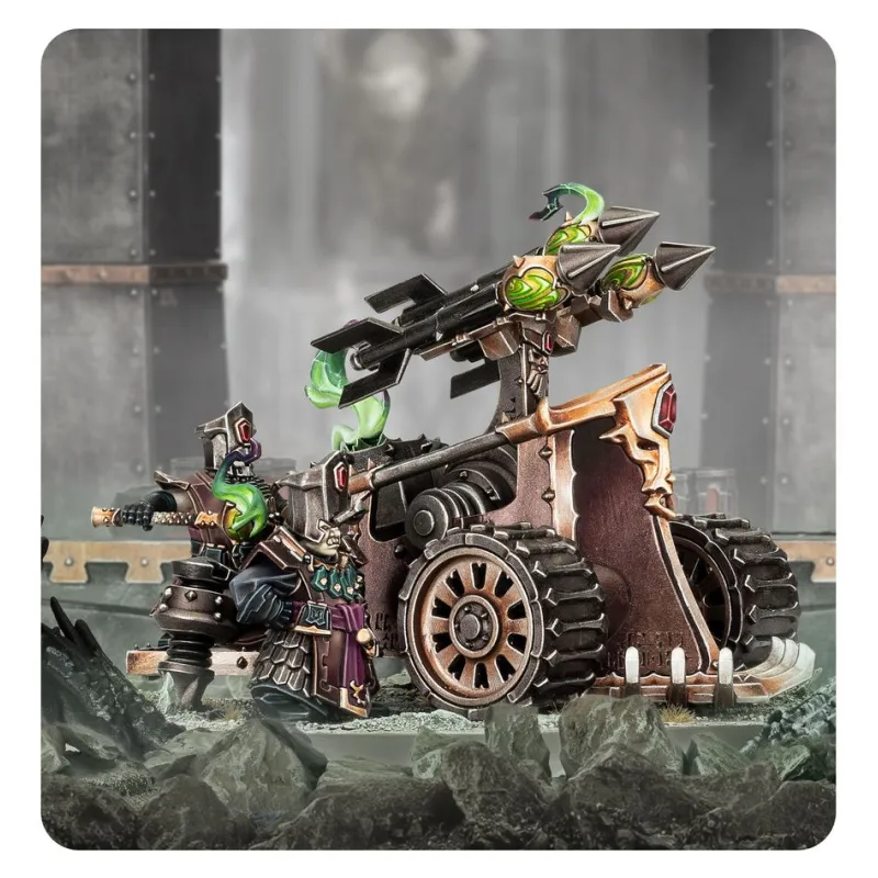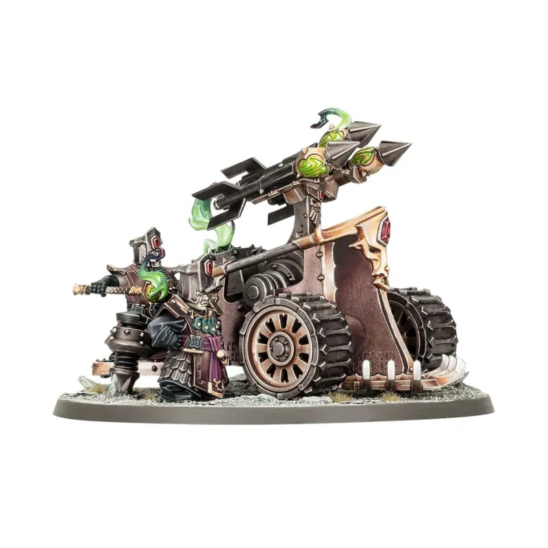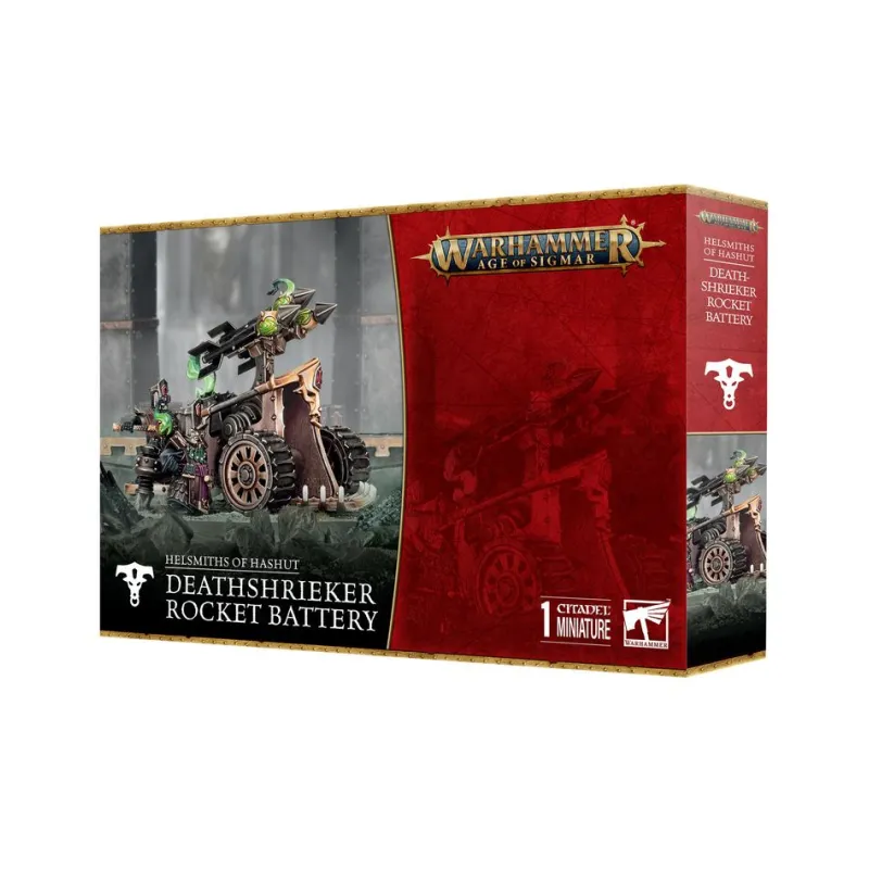 Batería de cohetes aullamuertes: una miniatura de plástico para Warhammer Age of Sigmar con clara vocación de asedio. Esta Batería de cohetes aullamuertes lleva la potencia de los Herreros Infernales de Hashut directamente a tu mesa. Aniquila monstruos y desbarata líneas con explosivos alimentados con energías daemónicas que castigan a distancia. Es ideal para Warhammer Age of Sigmar cuando debes derribar objetivos grandes con precisión y alcance.