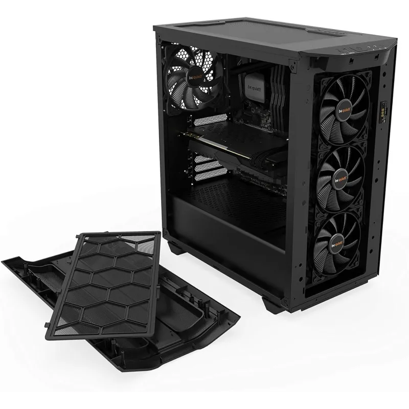 ALTO FLUJO DE AIRE Y MÁXIMO RENDIMIENTO: Todas las partes están optimizadas para el flujo de aire y el rendimiento. Para todos aquellos que buscan el máximo rendimiento y especialmente con sistemas refrigerados por agua, el Pure Base 500DX Black con su cubierta frontal y superior extremadamente permeable al aire es la elección correcta. Los filtros de polvo en la parte frontal e inferior son fáciles de quitar para su limpieza.