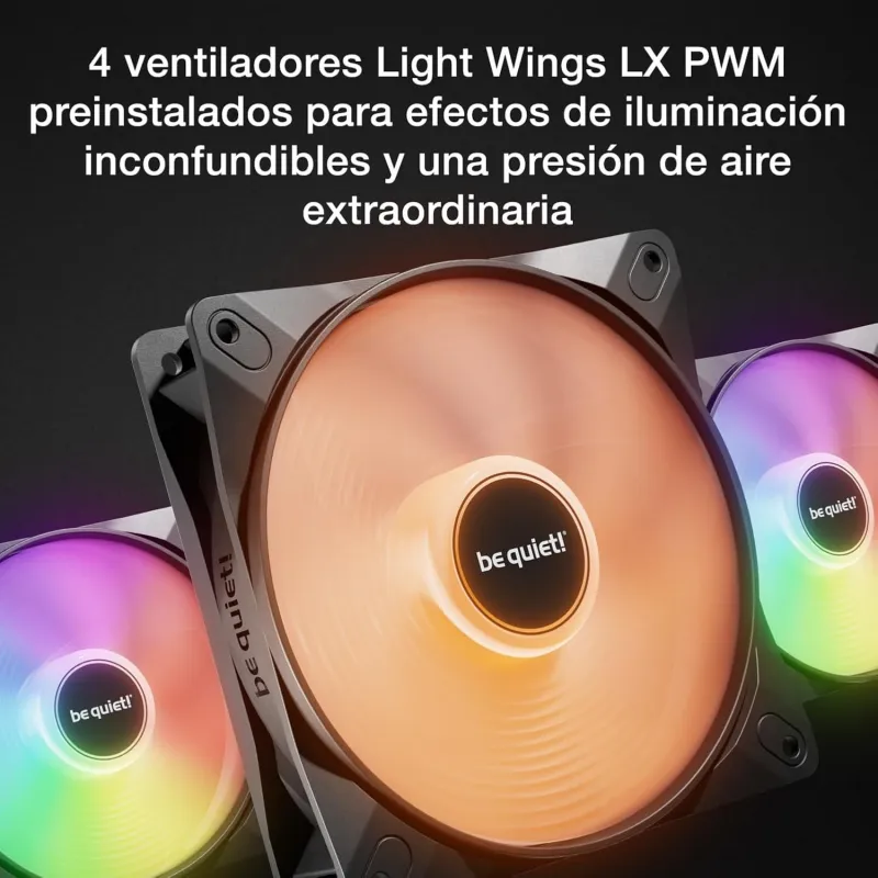 La torre Be Quiet! Pure Base 501 LX Black Negro ofrece un sistema de refrigeración optimizado con tres ventiladores frontales de 120 mm preinstalados, diseñados para mantener el flujo de aire constante y eficiente. Con un nivel de ruido máximo de solo 21,9 dB, garantiza un funcionamiento silencioso incluso en sesiones intensas. Además, es compatible con refrigeración líquida y admite radiadores frontales de hasta 360 mm. Esta configuración asegura un entorno térmico estable para componentes de alto rendimiento, mejorando la durabilidad y estabilidad del sistema. La integración de iluminación RGB multicolor en los ventiladores añade un toque visual atractivo sin sacrificar eficiencia.