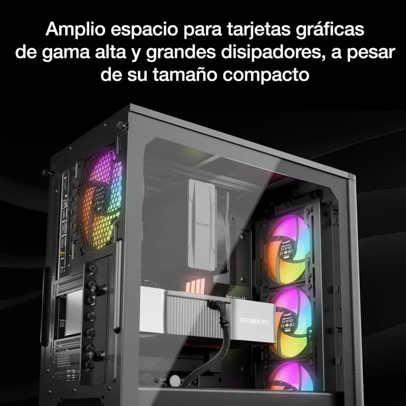 En términos de almacenamiento, la torre Be Quiet! Pure Base 501 LX Black Negro ofrece una excelente capacidad gracias a sus cinco bahías de 2.5 pulgadas y dos de 3.5 pulgadas, lo que permite montar múltiples unidades SSD y HDD sin complicaciones. Además, cuenta con siete ranuras de expansión para tarjetas gráficas de hasta 368 mm, y una altura máxima para el disipador de CPU de 178 mm. Su conectividad frontal incluye dos puertos USB 3.2 Gen 2 tipo A y un USB tipo C, junto con entradas y salidas de audio. Todo esto se complementa con filtros antipolvo fácilmente desmontables y un sistema de iluminación RGB multicolor integrado en los ventiladores. Compatible con fuentes de alimentación ATX y PS2 de hasta 200 mm, esta torre garantiza una gran flexibilidad para montajes avanzados y profesionales.