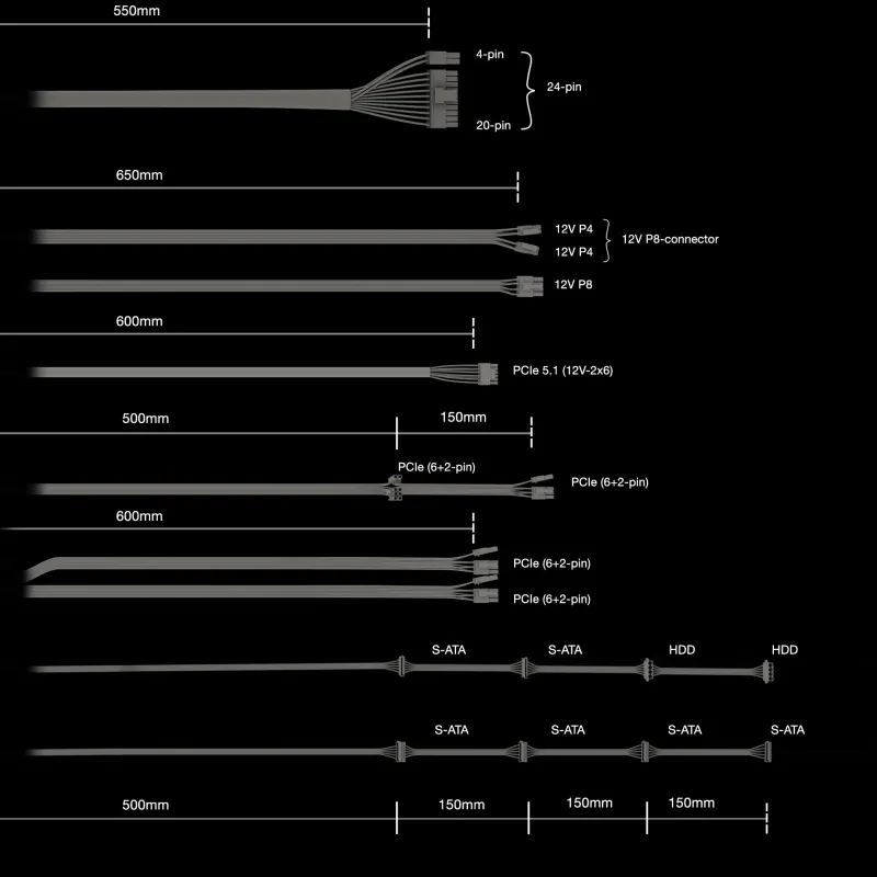 - Longitud del cable de alimentación SATA: 500,650,800,950 mm