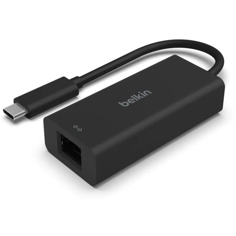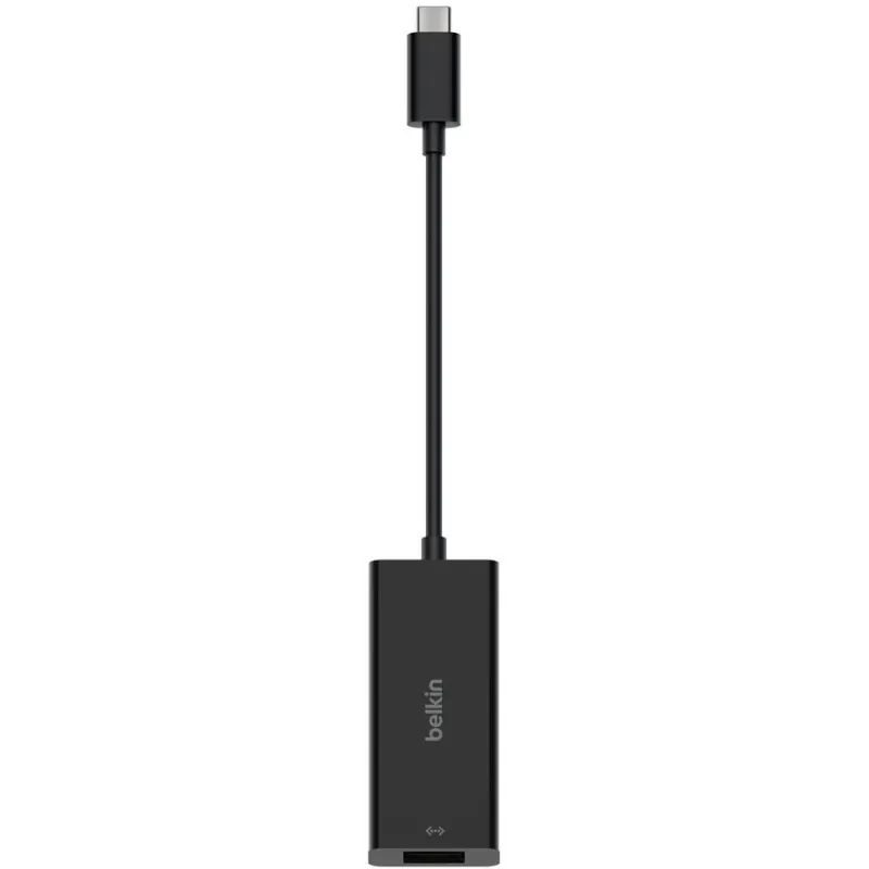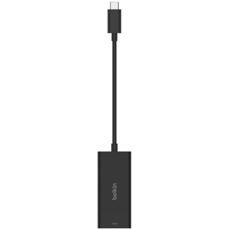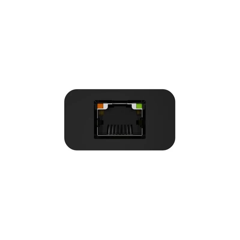 Adaptador Ethernet Belkin INC012BTBK con interfaz RJ-45, puerto USB tipo C 3.2 Gen 1, diseño en negro e indicadores LED
