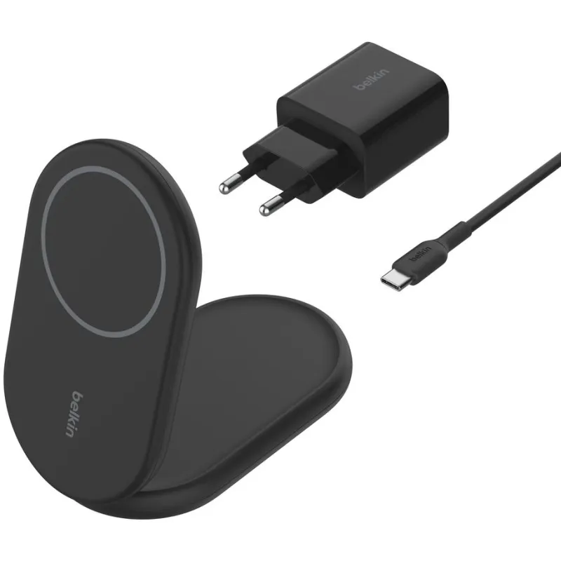 Belkin WIB007VFBK Base de Carga Plegable Magnética Belkin BoostCharge Qi2 de 15 W (negra) + Cargador de Red
