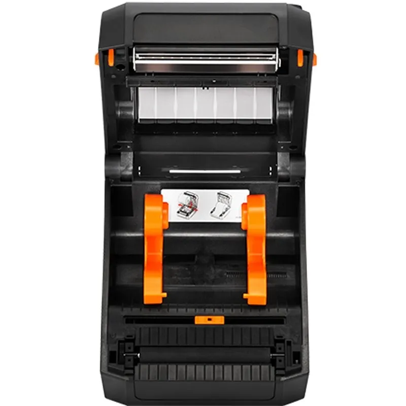 Con una interfaz USB, la impresora admite diversos tipos de medios como espacio, marca negra, muesca, continuo y plegado en abanico, con un ancho de medios de 15 a 118 mm y un diámetro de rollo de papel de hasta 127 mm. Su método de suministro de papel de fácil carga y compatibilidad con cintas de cera, cera/resina y resina, así como con diferentes dimensiones de cinta, la hace extremadamente versátil.