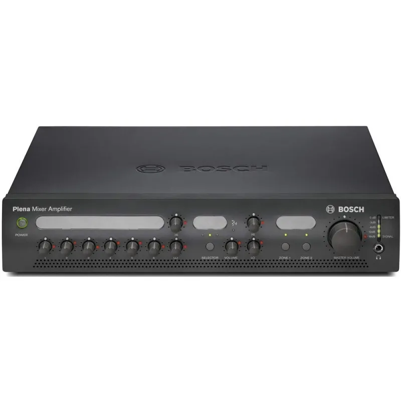 Estos mezcladores amplificadores Plena vienen en potencias de salida de 120 y 240 vatios. Esta potencia está directamente disponible en conexiones de voltaje constante de 100 V y en una conexión de baja impedancia para una carga de 8 ohmios. Además, los amplificadores tienen un canal de salida de solo llamadas de 100 V separado para dirigir áreas donde solo se requieren anuncios prioritarios. La salida de solo llamadas también puede usarse para control remoto de 3 hilos, anulación de volumen.
