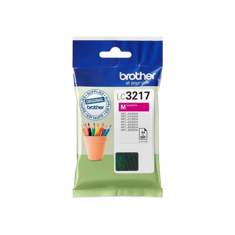 Brother LC-3217M. Tipo de tinta de color: Tinta a base de pigmentos, Tipo de suministro: Pack individual, Rendimiento de impresión de página con tinta de color: 550 páginas, Volumen de tinta de color: 550 ml, Cantidad por paquete: 1 pieza(s)