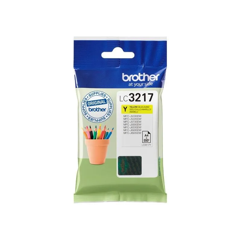Brother LC-3217Y. Tipo de tinta de color: Tinta a base de pigmentos, Tipo de suministro: Pack individual, Rendimiento de impresión de página con tinta de color: 550 páginas, Cantidad por paquete: 1 pieza(s)