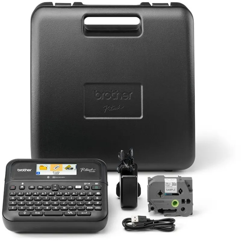 INCLUYE: Una cinta de 24 mm x 4 m, un práctico maletín de transporte y un adaptador de corriente CA. Funciona también con 6 pilas tipo AA para que puedas imprimir en cualquier lugar.