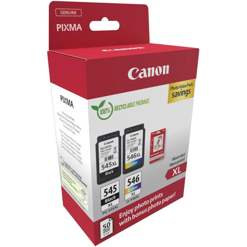 Un value pack para impresión cómoda. Este photo value pack incluye un depósito de tinta PG545XL negro de 15 ml y un depósito de tinta PG546XL en color de 13 ml así como 50 hojas de papel fotográfico con brillo de 10 x 15 cm para tu PIXMA. Imprime hasta 400 páginas de documentos A4 en blanco y negro o 300 de documentos A4 en color en el estándar ISO/IEC 24711.