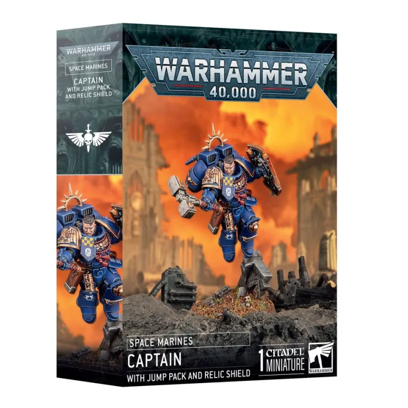 Capitán con propulsor de salto y escudo reliquia |  Warhammer 40.000 y Space Marines, 23 piezas de plástico, 1 peana de 40 mm, 2 cabezas, armas a elegir.