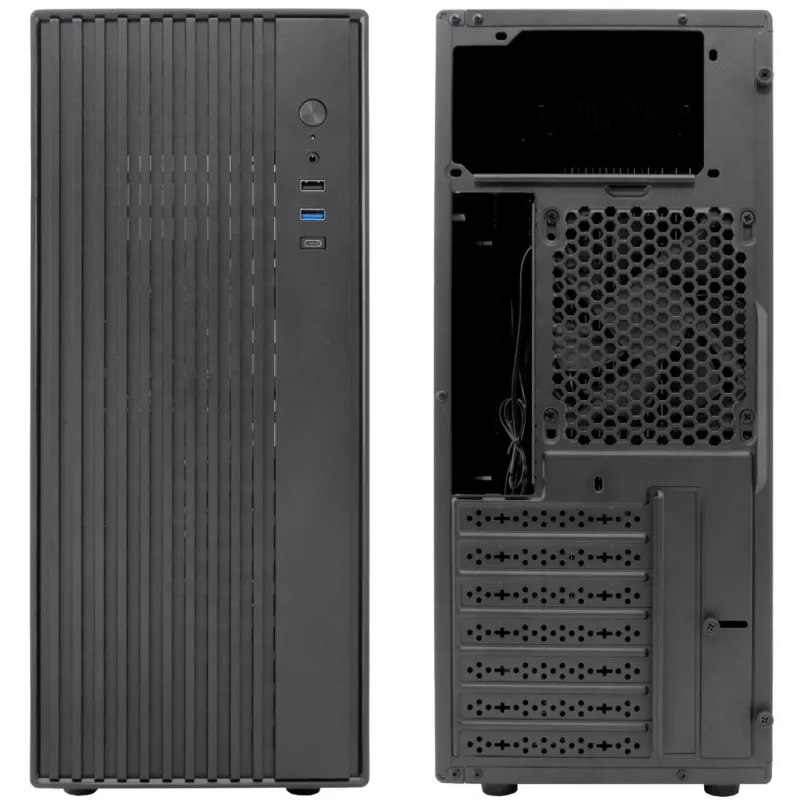 En cuanto a conectividad, la torre Coolbox incorpora puertos USB 2.0, USB 3.0 tipo A y tipo C, además de una salida combinada para auriculares y micrófono, lo que garantiza una experiencia de uso moderna y completa. El sistema de refrigeración está reforzado por un ventilador trasero 120 mm ya instalado, con posibilidad de añadir hasta dos ventiladores frontales y uno superior, todos de 120 mm, lo que mejora significativamente la circulación del aire en el interior del chasis. Su fuente de alimentación se instala en la parte superior y es compatible con el formato ATX, aunque no está incluida. Con un peso de 3,71 kg y unas dimensiones compactas de 185 mm de ancho, 395 mm de profundidad y 425 mm de altura, esta torre se adapta fácilmente a distintos espacios. Su diseño sobrio en color negro, junto con indicadores LED y botón de encendido accesible, completa una propuesta equilibrada y funcional para quienes buscan fiabilidad y adaptabilidad en su equipo de sobremesa.