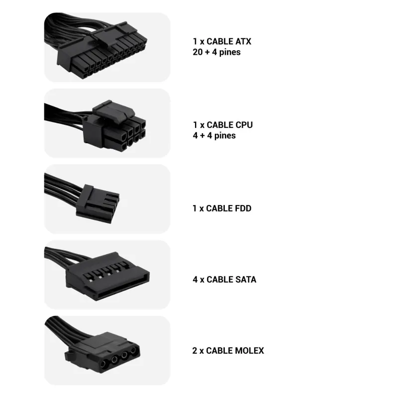 VERSATILIDAD DE CONEXIONES: La adaptabilidad es fundamental en el mundo de la informática. Este dispositivo cuenta con un alimentador de energía para tarjeta madre de 20+4 pin ATX, dos conectores de energía SATA y dos conectores de poder de 4 pines periféricos (Molex), que brindan una amplia gama de opciones para conectar diversos componentes. Además, dispone de un conector CPU P4 de 4 pines, integrando así una solución completa y eficaz para cualquier necesidad.